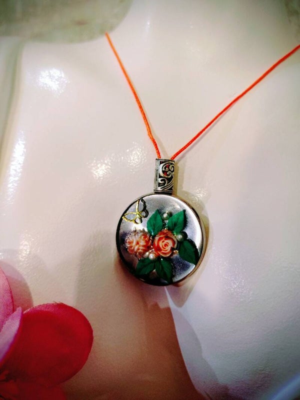 Collier pendentif médaillon roses oranges